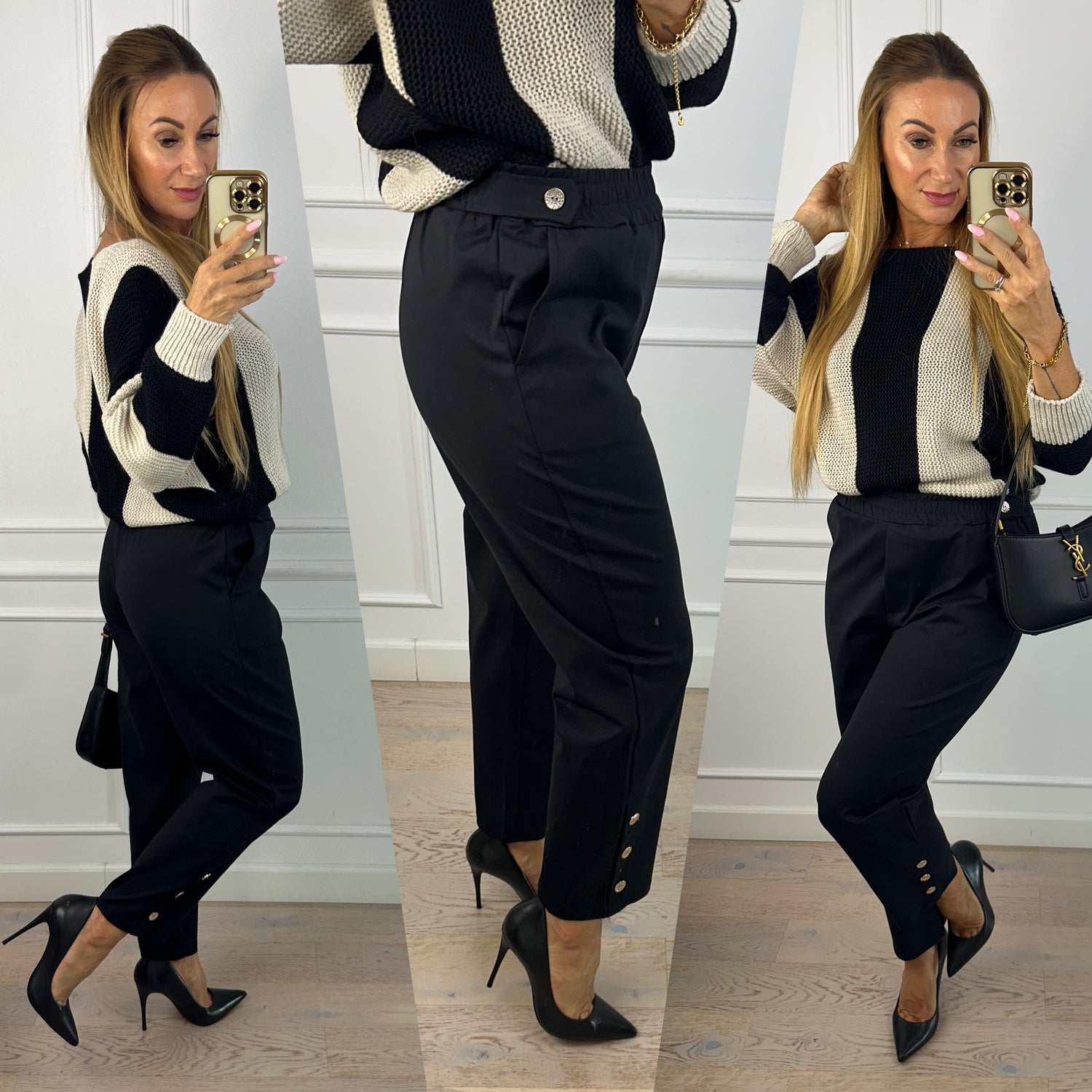 - Nogawki : swobodne w udzie / ozdobne guziki na dole