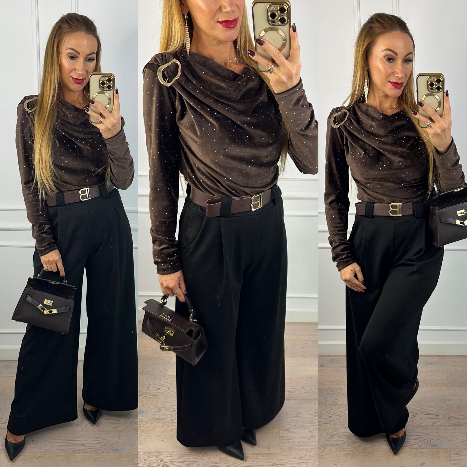 Welurowa bluzka z błyszczącymi dżetami BRUNA / CZEKOLADOWA