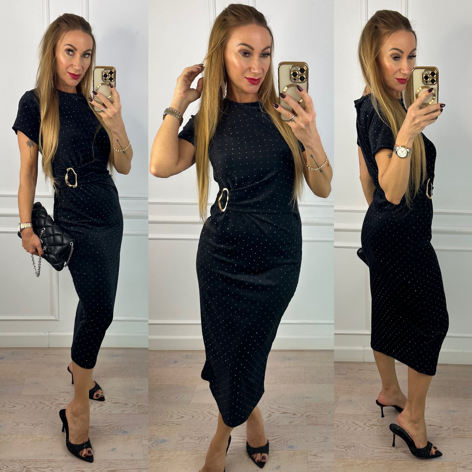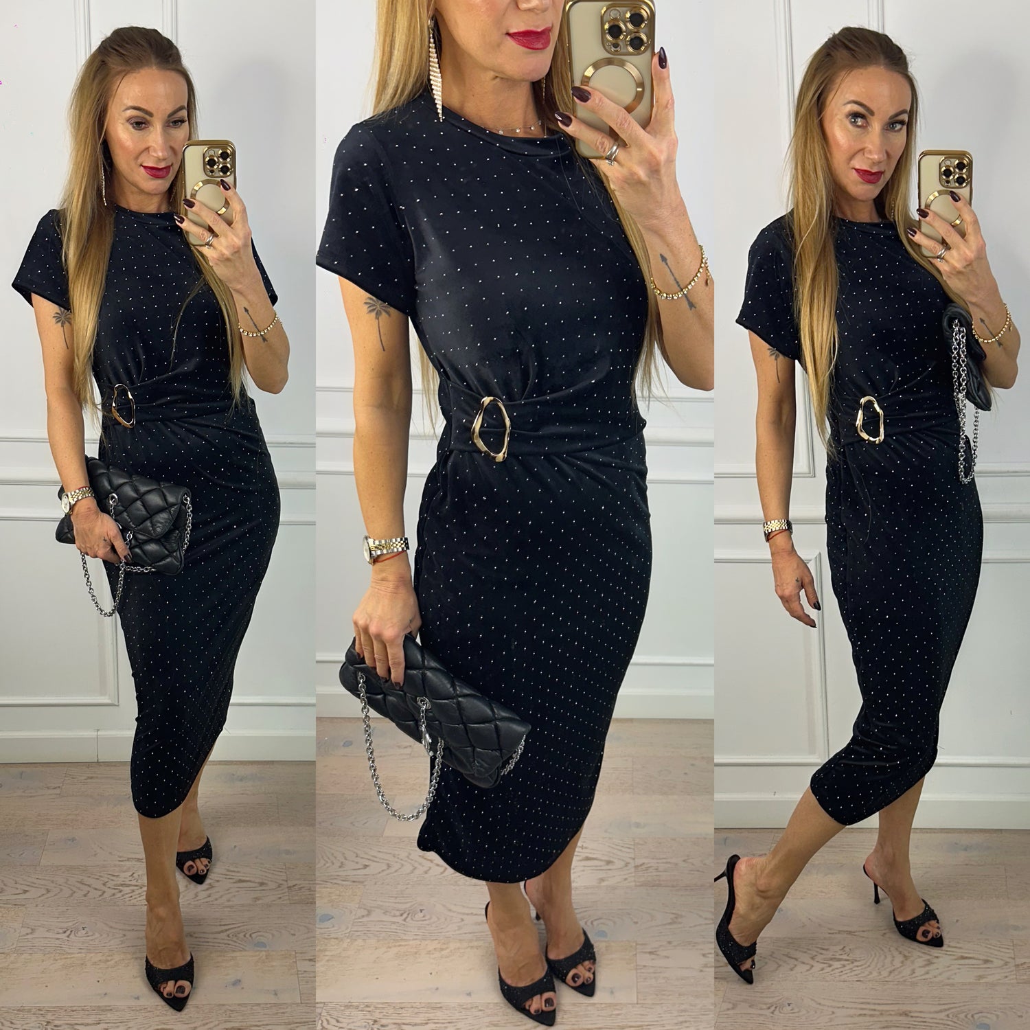 Welurowa sukienka z błyszczącymi dżetami SILVIA / CZARNA